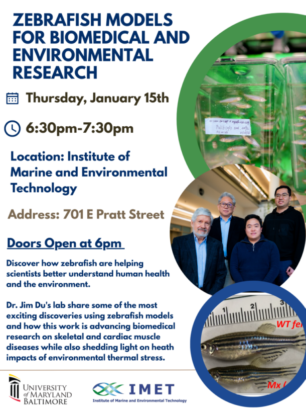 Join IMET to discover how zebrafish are powering breakthroughs in human health and environmental research. On Thursday, January 15, Dr. Jim Du’s lab will share exciting findings from zebrafish models, including advances in biomedical research on skeletal and cardiac muscle diseases and new insights into health impacts of environmental thermal stress.